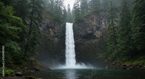 Majestic Waterfall in Lush Forest, Rainy Day