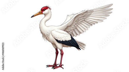 Majestic white bird with red crown and spread wing isolated on white background for marketing campaigns, advertising, and corporate branding with copy space for text