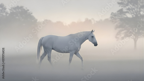 Majestic white horse gracefully walks through misty morning meadow, ethereal atmosphere