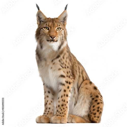 Majestic wild feline with large pointed ears and striking amber eyes, sitting upright with alert expression on pure white background