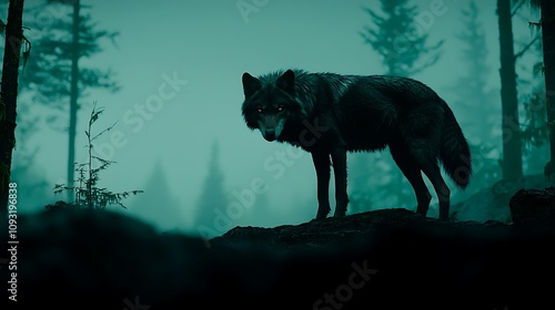Majestic Wolf Standing Proudly in Dense Forest Surrounded by Mist, Capturing the Essence of Wilderness and Natural Beauty in Enigmatic Atmosphere