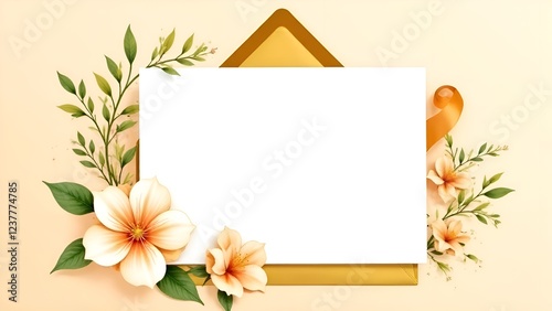 Макет открытки с местом для текста. Золотой фон с белым листом розами и лентами