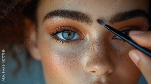 make-up, application, freckled, face, blue, eye, eyebrow, brush, cosmetic, beauty, model, close, up, detail, skin, texture, freckle, hazel, eye, lash, mascara, eyeshadow, orange, bronze, palette, artist, professional, hand, applying, precise, meticulous, careful, delicate, artistry, fashion, glamour, elegant, feminine, gorgeous, woman, girl, portrait, style