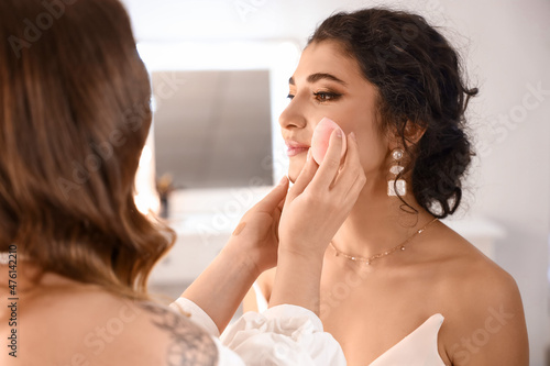 Makeup artist working with beautiful model in beauty salon