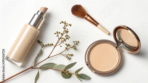 make-up, foundation, brush, powder, cosmetic, beauty, product, face, skin, tone, complexion, footed, cream, liquid, bottle, applicator, tool, compact, mirror, plant, tree branch, leaf, flower, natural, organic, minimal, flat, lay, still, life, arrangement, studio, shot, style, fashion, glamour
