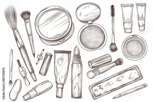 Makeup kit drawing: sketch mascara, nail polish, foundation doodle, mirror, lipstick, brush, cosmetic
