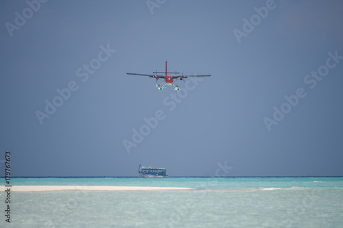 sea, water, hydroplane, indian ocean, boat, sky, plane, beach, aircraft, aeroplane, blue, flying, travel, sunset, paradise, yacht, air, flight, jet, aviation, transportation, holiday, luxury