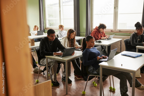 casual clothes, comfortable, portability, laptop, day, computer, e-learning, europa, photo, color image, window, horizontal, learning, indoor, cyberspace, classroom, communication, concentration, leaning, reading, sitting, scandinavia, desk, stockholm, studying, sweden, technology, tennis ball, teenage, wireless technology, connection, education