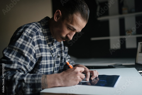 abundance, art, artist, home, authentic, casual clothes, concentration, creativity, desk, drawing, hobby, home office, imagination, individuality, indoor, inspiration, lifestyle, male, man, one person, passion, real people, half face, vignetting, sketchbook, sketching, skill, studio, tattoo, wearing, working, young, young adult, young men