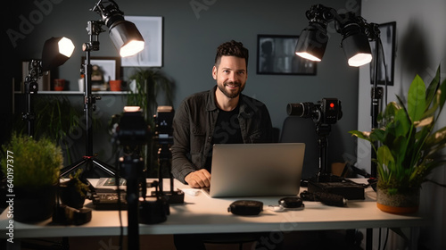 technology, camera, cyberspace, online, man, home, video, recording, young, person, blog, smartphone, lifestyle, live, happy, professional, phone, studio, male, digital, indoor, mobile, creator, streaming, content, broadcasting, microphone, record, stream, equipment, media, smiling, shooting, tutorial, office, web log, business, background, broadcast, filming, laptop