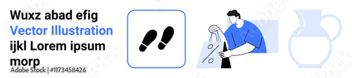 Male character carrying a shopping bag with a discount sign, footsteps icon, and pitcher outline. Ideal for online shopping, e-commerce, discounts, retail marketing, shopper behavior, sales