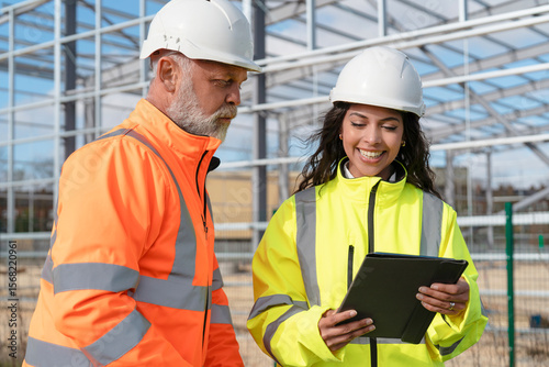 Male construction works project manager and young female site engineer collaborating on-site, discussing project details and future plans at building site with steel frame structure in background