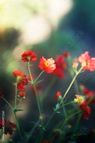 Małe czerwone kwiatki na zielonym rozmytym tle