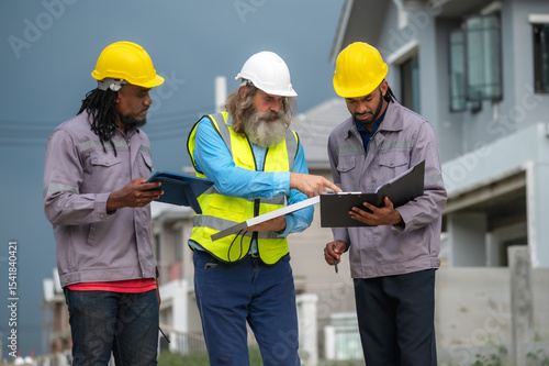 Male diversity site engineers team brainstorming in construction site
