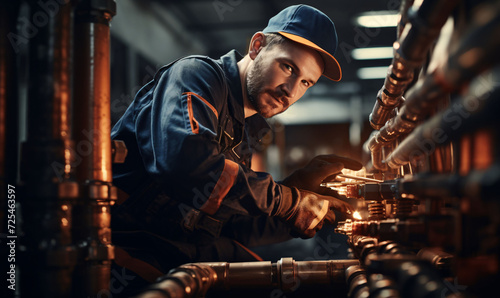 Male engineer working on valve water pump inspection and maintenance for safety. A worker inspects the building's water system.