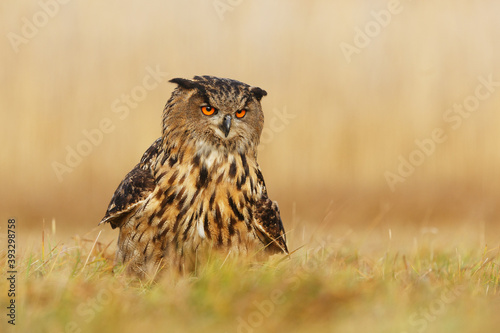 male Eurasian eagle-owl (Bubo bubo) sitting on the ground in the low grass, beautiful portrait