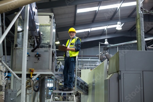 Male factory worker maintaining record on clipboard