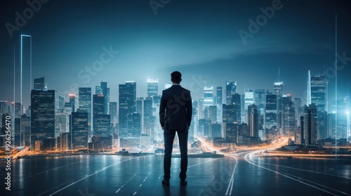 man, standing, front, futuristic, city, digital, blueprint, overlay, technology, future, urban, construction, architect, design, blueprint, modern, development, innovation, progress, businessman, work, project, creative, render, three-dimensional, skyline, engineer, planning, architecture