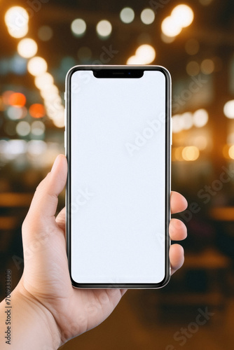 Male hand holding smart phone with blank screen on blurred background, mock up