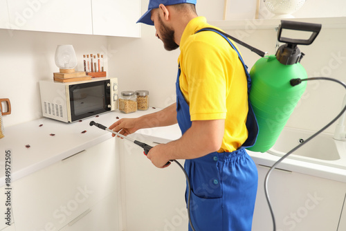 Male pest control specialist disinfecting counter for cockroaches in kitchen