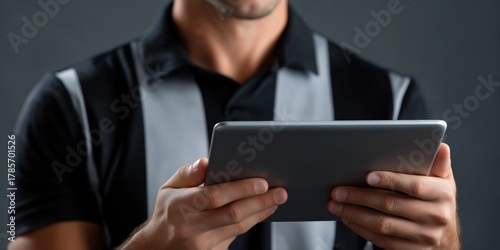 male, ref, digital, device, sport, caucasian, young, tablet, technology, uniform, black, stripes, interaction, focused, hand, modern, game, decision, judgement, control, authority, analysis, equipment, field, screen, wireless, touch screen, concentration, strategy, communication, review, rule, regulation, score, match, evaluation, professional, electronic, innovation, update, monitor, observation, inspection, game plan