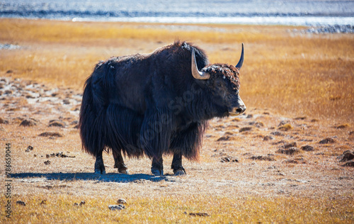 Male wild Tibetan yak on high-altitude pasture in autumn.