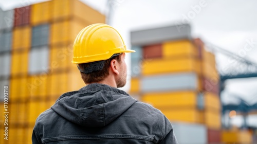 logistic, inspection, cargo, industry, yellow, chain, export, caucasian, men at work, back, engineering, terminal, commerce, container, industrial, import, employee, jacket, environment, operation, maritime, international, outdoors, infrastructure, trade, storage, hard hat, construction, young, dock, economy, transport, business, sharpened, safety, freight, shipping, occupation, male, yard, organisation, supply, port, labor