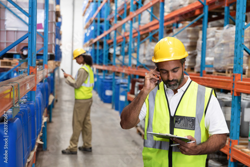 Male worker talking on mobile phone in warehouse