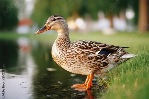 duck, anas platyrhynchos, water bird, bird, animal, wildlife, nature, outdoors, duck pond, water, grass, park, standing, profile, half face, plumage, brown, orange beak, webbed feet, feeder, wild, environment, fauna, ecosystem, freedom, peace, calmness, exploring, summer, spring, daytime, serene, avian, beak, feather, sharpened, beautiful, detail, texture, calm, tranquil, green, reflections, looking, feeding, walking, shore
