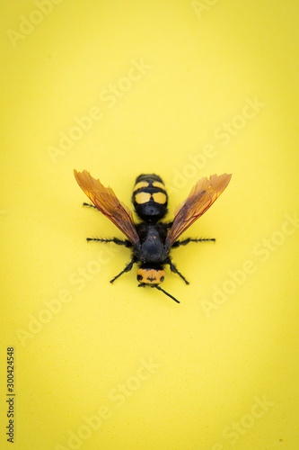 Mammoth wasp, Megascolia maculata, Huge wasp on yellow background in a flat surface, Macro