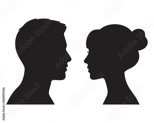 silhouette, black, white, man, woman, profile, face, head, hair, bun, side, view, couple, human relationships, love, together, design, graphic, shape, minimal, simple, abstract, communication, partner, romance, people, human, male, female, portrait, art, vector, illustration, person, nubes, boy, icon, family, kiss, children, beauty, man, outline, symbol