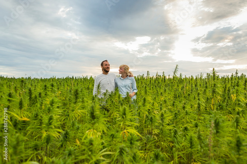 Man and woman proudly standing in their marijuana CBD hemp plants field.