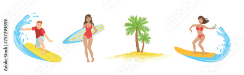 man, woman, surfer, character, surfboard, set, male, female, hawaiian, vacation, wave, illustration, summer, travel, beach, sea, ocean, sport, young, extreme, tropical, water, board, palm, figure, adventure, athlete, california, island, sand, paradise, relax, swimwear, recreation, holiday maker, leisure, resort, enjoy, excited, rest, lifestyle, activity, person, isolated, colourful, art, vector