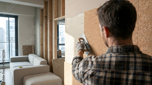 Man applying adhesive to cork wall panel in modern interior living space enhancing home renovation efforts with contemporary furniture and large windows showcasing urban view