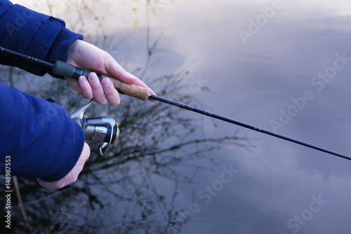 Man catches fish, a close up of a hand and the spinning reel. Fishing with a spinning on the river.