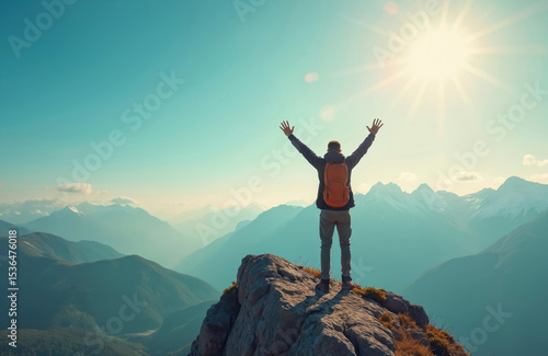 Man celebrates success on mountain top with arms raised. Hiker stands on cliff with blue sky background. Achievement, freedom, healthy lifestyle, goal, travel, tourism, sport activities concept.