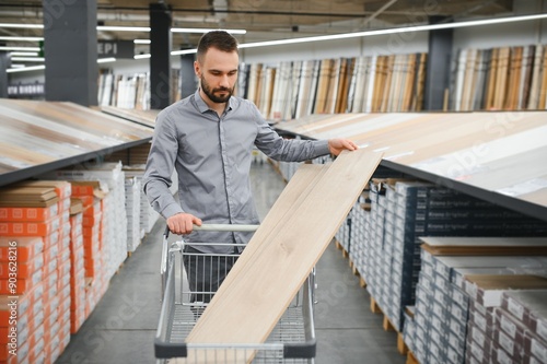 Man choosing flooring in hardware store