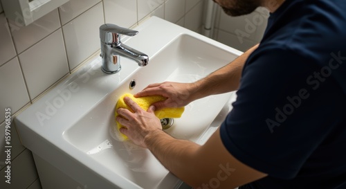 white, bright, sanitary, hand, bathroom, cleaning, sponge, clean, faucet, sink, laundered, basin, shining