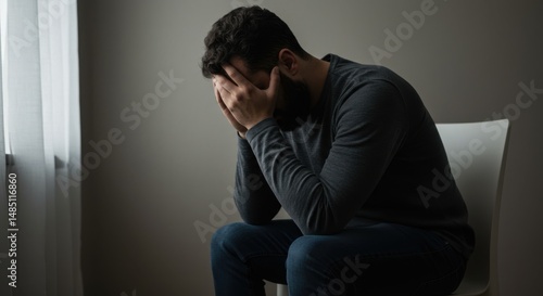 Man covering face represents stress and emotional pain, seated on chair in dim light