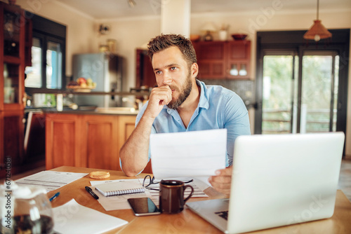people, document, thoughtful, caucasian, concentration, laptop, kitchen, paperwork, analysing, reading, reviewing, sharpened, adult, male, work, home, desk, freelance, business, task, study, pensive, concerned, professional, planning, responsibility, modern, decision, dedication, research, evaluation, indoor, domestic, table, bill, financial, casual attire, morning, routine, beverage, note, stationery, hot drink, management, organised, reflective, understanding, copy space