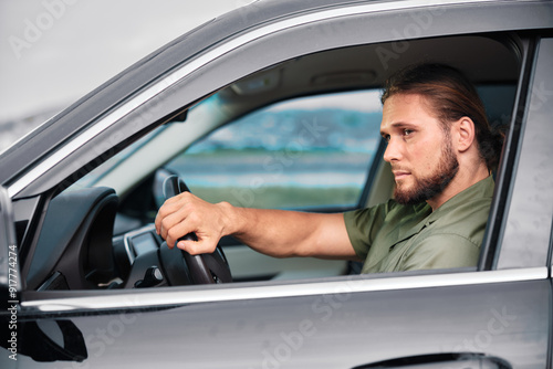 man, car, driving, thoughtful, urban, expression, beard, hair, outdoors, contemplation, vehicle, city, landscape, travel, lifestyle, portrait, casual attire, adult, male, person, road, traffic, modern, journey, scenery, evening, experiencing, emotion, nature, urbanity, style, motion, relaxation, freedom, adventure, sharpened, observation, setting