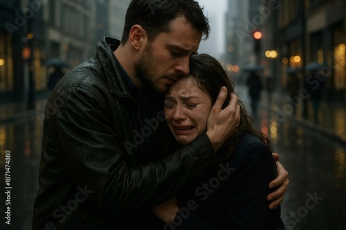 Man embracing and comforting a young woman crying in the rain on an urban street, showing support and empathy