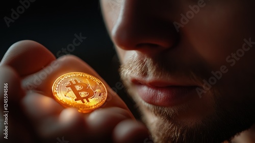 Man examining Bitcoin, dark background, finance concept