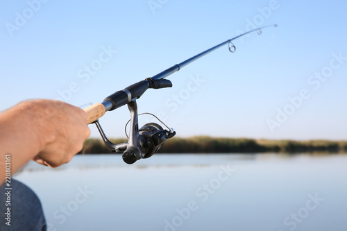 Man fishing alone at riverside on sunny day, closeup