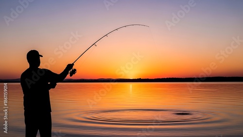 fishing, sunset, lake, silhouette, man, water, nature, peaceful, calm, evening, recreation, leisure, relaxation, rod, sport, landscape, horizon, orange, sky, ripple