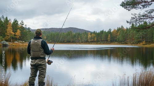 fishing, fly fishing, lake, autumn, nature, outdoors, tranquil, serenity, landscape, scenery, calm, water, outdoorsman, man, fishing pole, peaceful, forest, tree, mountain, calmness, stillness, travel, relaxation, hobby, leisure, activity, adventure, scenic, outing, vest, pant, equipment, serene, quiet, foliage