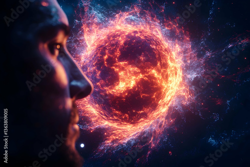 fire, energy, sphere, cosmos, space, man, face, profile, gazing, intense, power, fiery, cosmic, nebula, explosion, bright, glowing, heat, hot, plasma, abstract, surreal, digital, art, science, fiction, fantasy, mystery, wonder, awe, contemplation, thought, universe, galaxy, star, sun, light, dark, blue, red, orange, particle, swirling, vibrant, dramatic, background, texture