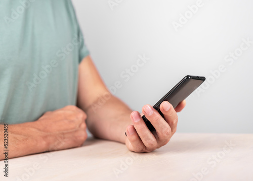 Man hand closeup holding phone. Male using smartphone for reading news, book, watching video. Digital technologies in modern life