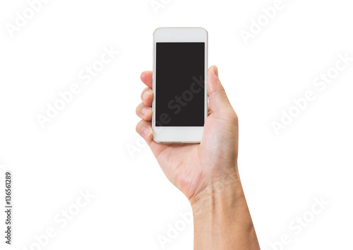 Man hand holding mobile phone isolated on white background. clip