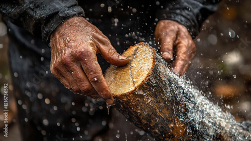 man, hand, log, fire, wood, preparation, spark, chopping, nature, closeup, carpenter's shop, tool, sawdust, rustic, craftsmanship, forest, winter, warmth, campfire, labor, texture, detail, action, energy, environment, seasonal, firewood, cutting, timber, bark, natural, woodpile, skill, tradition, survival, camp, manual labor, woodwork, artisan, forestry, timbering